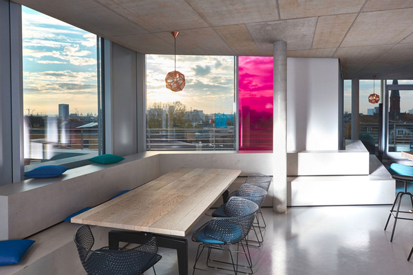freiheit公司的文化精神通過(guò)室內(nèi)的裝飾材料和形式得以表達(dá)。組織團(tuán)隊(duì)的開(kāi)放辦公區(qū)裝點(diǎn)以超大型的木制工作臺(tái);這里配有生活廚房、大禮堂以及亮麗的創(chuàng)客空間,隨手涂寫的黑板墻、大型木制工作臺(tái)、甚至還有壁爐,公司的程序員都在這個(gè)頂層空間共同辦公、合作與休閑交流。