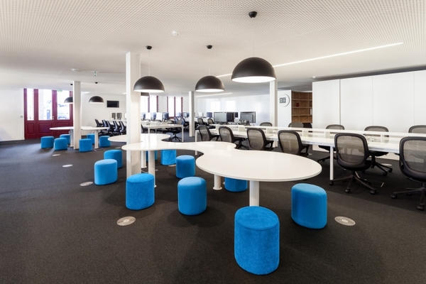 其辦公室裝修通過創(chuàng)造一個開放的工作空間,加強(qiáng)了公司各部門之間的交流。通過在開放空間之中的沉思場所的設(shè)計(jì)也達(dá)到了個人和集體的平衡。因此,小空間通過固定的元素,如圖書館和半開放會議室,或可移動的家具,如一些用于 Skype 聊天的構(gòu)筑物,得到了巧妙的利用。
