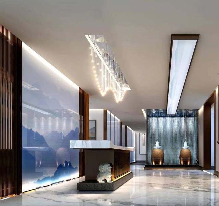 項(xiàng)目采用了禪意文化的手法進(jìn)行設(shè)計(jì),這個空間即融入了中國傳統(tǒng)風(fēng)格文化與現(xiàn)代時尚之中,既有中式的古香古色,又有現(xiàn)代的簡單自然,東方韻味在現(xiàn)代的背景下若隱若現(xiàn),簡約的中式造型與現(xiàn)代形式轉(zhuǎn)變?yōu)槭孢m,實(shí)用,為現(xiàn)代辦公設(shè)計(jì)重重的添了一份古典的韻味。禪意辦公室大廳設(shè)計(jì):以現(xiàn)代手法將古典語言融入中式意境,整個空間散發(fā)出悠然禪文化。頂上一通而過燈飾造型,如同一條河流,在對面機(jī)刨石上如瀑布般潺潺流下,兩個古樸的老缸不停地冒著噴泉。用較少即多的表現(xiàn)方式直接明了的體現(xiàn)了整個空間文化氛圍,留白的墻,黑色原始頂,現(xiàn)代中式家具與禪意的辦公桌,在現(xiàn)代與傳統(tǒng)的相碰中呈現(xiàn)出了一個既有文化又有時尚感的辦公空間。