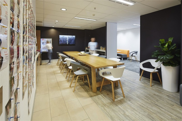 5、服裝公司辦公室裝修設(shè)計(jì):接待處位于底樓的正門,設(shè)有休息室和會(huì)議空間,可容納訪客。接待區(qū)周圍的定制墻板模仿了織物的褶皺,并為零售品牌的工作場(chǎng)所提供了設(shè)計(jì)敘事。提供各種團(tuán)體座位安排的所有團(tuán)隊(duì)成員的共用食堂位于地下室。開(kāi)放式辦公室和休息區(qū)沿著面向公園一側(cè)的全高立面玻璃排列,使員工在工作期間可以欣賞郁郁蔥蔥的綠色美景。玻璃隔斷用于將會(huì)議室、私人櫥柜與開(kāi)放辦公室分隔開(kāi)來(lái),充分利用自然光線,創(chuàng)造一個(gè)透明通風(fēng)的工作場(chǎng)所。白色、灰色和黑色的基本色調(diào)與天然的木材和石材表面作為重點(diǎn),為工作場(chǎng)所的創(chuàng)造性工作創(chuàng)造了一個(gè)干凈和舒適的背景。墻面紡織面板和天花板護(hù)罩可確保共享空間和封閉空間所需的聲學(xué)特性。