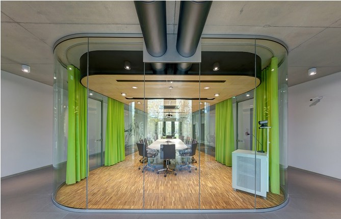 辦公室設(shè)計(jì)效果圖,室內(nèi)設(shè)計(jì)上,建筑師放棄了吊頂,將混凝土天花板直接暴露。室內(nèi)辦公區(qū)采用了大面積的玻璃窗,不僅光線明亮,也與室外發(fā)生更緊密的聯(lián)系。部分空間為了防止過(guò)熱以及過(guò)多陽(yáng)光射入,配備了不妨礙用戶欣賞室外風(fēng)景的百葉窗。