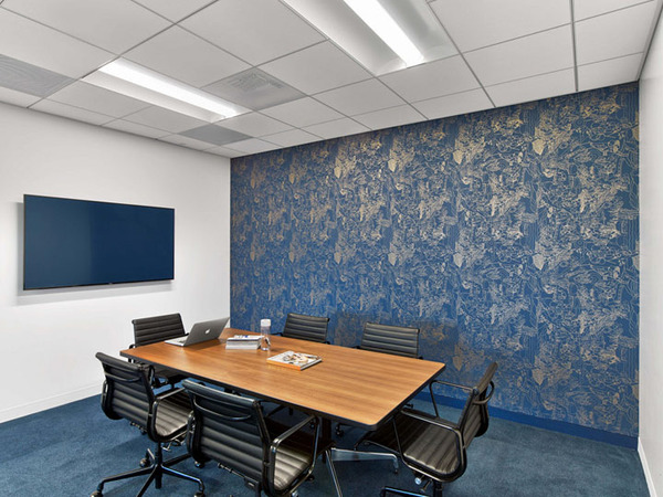 橡木定制的辦公家具和白色亞光鋼架、精挑細(xì)選的壁紙、雪白色的接待臺(tái)以及休閑茶水區(qū)的網(wǎng)狀編織吊燈。