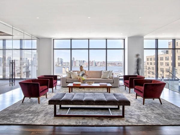 精致皮革裝飾的電梯廳面向開敞明亮的休閑區(qū),高大的落地玻璃窗將遠(yuǎn)處哈得遜河的美景盡收眼底。設(shè)計(jì)取消傳統(tǒng)的接待臺(tái)模式,以簡約的現(xiàn)代禮遇打造個(gè)性化的服務(wù)體驗(yàn)。