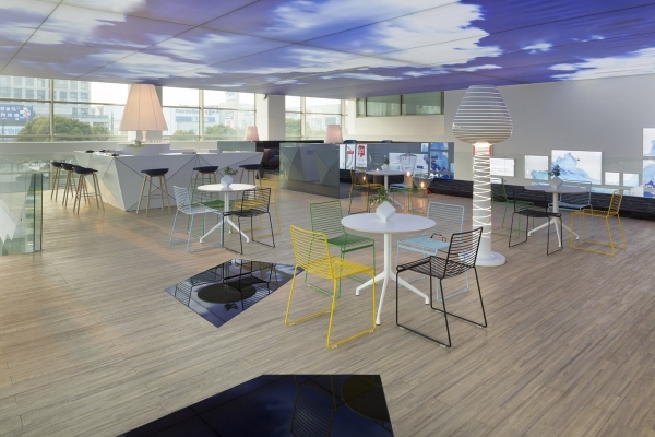 盡管這是個(gè)室內(nèi)空間,裝修設(shè)計(jì)師仍希望通過(guò)大自然的圖案為來(lái)客營(yíng)造舒適的感覺(jué)。天空?qǐng)D案的天花,樹(shù)形的支柱,植物圖形,明亮的淺色調(diào),木制材料和流線型的花園等,這些眾多的元素都將這個(gè)展廳裝點(diǎn)得與傳統(tǒng)意義上的售樓展廳與眾不同。