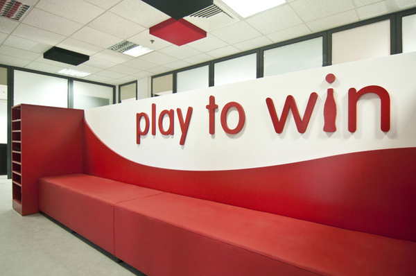 紅色代表著激情與夢想,傳遞出一種積極向上的工作與生活態(tài)度。辦公區(qū)域則引入了大量的規(guī)則幾何體設計,給人一種彩色拼裝積木的視覺感受,質感中不失童真與樂趣。而“Excel、Amaze、Play to Win”等大幅設計字體的運用,不僅起到了很好的裝點空間效果,也是不同工作區(qū)間的醒目劃分。