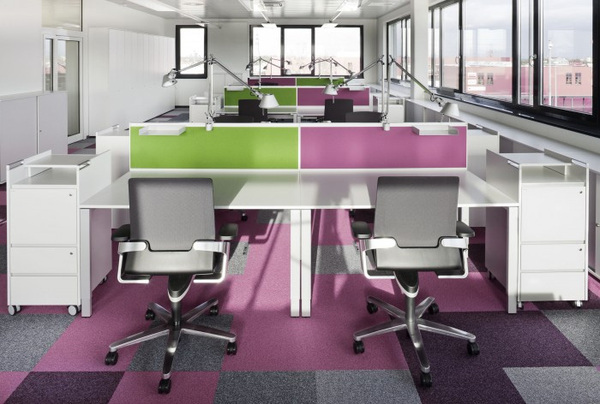 室內(nèi)中庭一條寬敞的洋紅色樓梯將上下貫穿在一起,開敞的空間促進員工間的交流與合作。洋紅、魅紫和新鮮的草綠地毯,將中庭空間裝扮的猶如美麗的調(diào)色盤,優(yōu)雅清新靚麗。