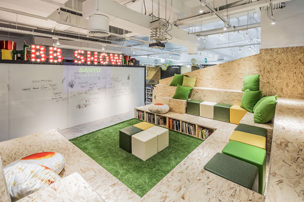 辦公區(qū)域的設計,設計師將奇思妙想融入空間,交流區(qū)域的背部被設計師開發(fā)出各式各樣的洞口,為的就是安置辦公設備,以此滿足辦公需求,真可謂是創(chuàng)意無限。