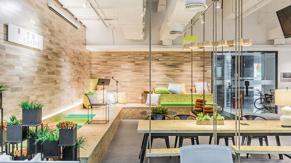 休息區(qū)域書桌區(qū)域的設計,開放式空間的設計難度在于界限的設置,辦公桌本身就是自帶邊界的,一則為員工休息空間的辦公空間,供大家在此地辦公,二則利用辦公桌的屬性為空間搭建新的功能區(qū)域。