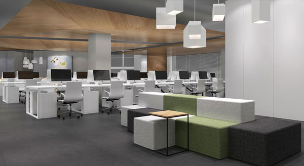 辦公區(qū)域的設計,設計師主要為了突出交流功能,以固定的工作位置來增強團隊合作的便利性。
