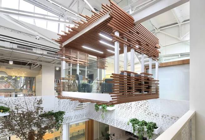 案例四:辦公樓前廳的整體設(shè)計(jì)同樣采用極簡(jiǎn)潔的設(shè)計(jì)風(fēng)格,墻面肌理粗獷自然,前臺(tái)的造型及材質(zhì)簡(jiǎn)單又不失穩(wěn)重的質(zhì)感,通高白色墻面正對(duì)著入口并投影播放畫(huà)面,時(shí)常宣傳公司的企業(yè)文化,在靜態(tài)中增加了整體裝飾的動(dòng)感。中庭至上我們能看到一個(gè)倒掛的“樹(shù)屋”空間,由鋼結(jié)構(gòu)搭建而成。實(shí)木條拼接包裹外圍,猶如深林木屋,幫助人們減壓。透明玻璃墻面的圍合,使整個(gè)空間更加通透開(kāi)闊,與整個(gè)辦公空間密切聯(lián)系。充分利用空間的同時(shí),大大增加中庭結(jié)構(gòu)的層次感,造型上也更加豐富。辦公室裝修設(shè)計(jì)以白色簡(jiǎn)潔為基調(diào),島臺(tái)圍合式的辦公桌設(shè)計(jì)整潔而連續(xù)。而開(kāi)放式的休閑討論區(qū),便于員工們交流與共享。員工休閑餐飲區(qū)域位于二樓,這里同時(shí)設(shè)計(jì)了連接室外的休憩平臺(tái),讓員工在工作之余可以感受室外自然。樹(shù)屋的頂部還有一個(gè)小型喝茶享受空間,發(fā)揮空間優(yōu)勢(shì),更好地利用疊層關(guān)系。