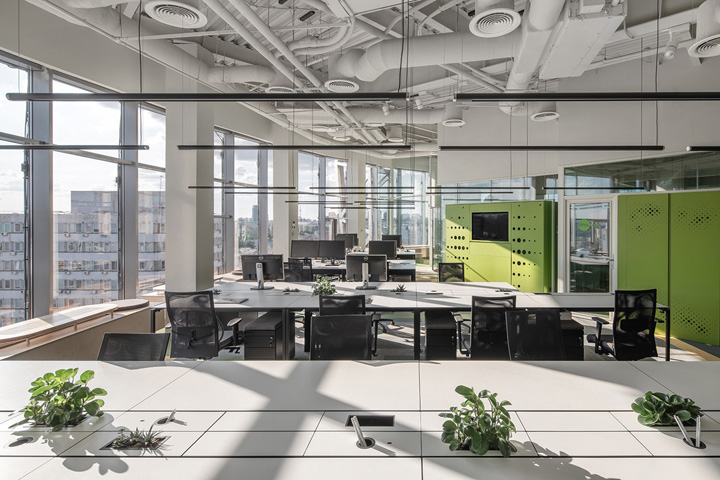 3、混搭風格辦公室設計:原始的混凝土柱和墻壁,以及磚飾面營造出工業(yè)外觀。木質元素,大理石細節(jié)和經典的簡約家具則增添了許多優(yōu)雅。線性照明和聲學結構在開放的白色天花板下動態(tài)布置,營造出現(xiàn)代寬敞的內部空間,激發(fā)創(chuàng)造性工作。