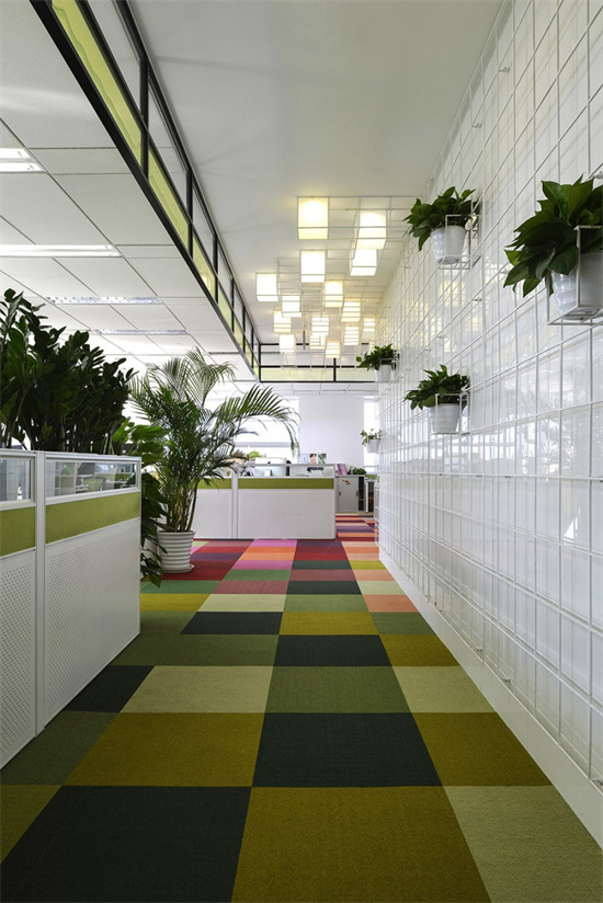 2000平方辦公室裝潢以彩色玻璃隔斷的顏色分出四個會議區(qū)域,紅黃藍綠。每個區(qū)域中的顏色又都有十幾種微妙的變化,共計54種彩色玻璃的顏色,在環(huán)形走廊上完成色彩的循環(huán)。在墻面上,設計師用白色瓷磚做辦公空間內環(huán)形走道的墻面。利用材料的反射性能,彩色光暈在空間中能流動起來。像水彩在紙上洇開一樣,形成氤氳彌漫的效果。同時,考慮到辦公空間的進深較大,白色瓷磚能夠反射外部光線,增加室內空間的光亮度。