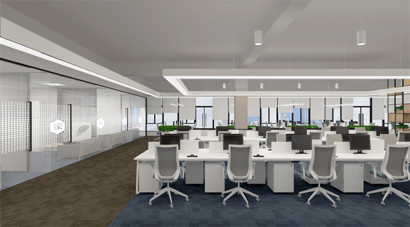 2、其次辦公空間內(nèi)靠近過道的獨立辦公室,靠近過道的一面盡量使用玻璃隔斷,以玻璃隔斷的通透性為空間視覺帶來更佳寬敞的體驗。辦公室內(nèi)天花不宜過低,如果公共辦公區(qū)很大,層高卻不夠高的話,可以在公共辦公區(qū)使用裸頂,過道和其他地方使用吊頂。這樣公共辦公區(qū)與過道天花的對比不僅能清晰的劃分公共辦公區(qū)的空間,也能夠使空間垂直延伸感增強,使人在視覺感處上更加舒適。
