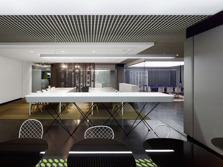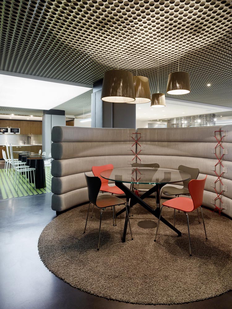 其概念是設(shè)置一個為所有部門共用的交流空間,以及滿足不同協(xié)作需要的不同分區(qū)。原先單獨、分散化的辦公室變成大型開放式的辦公空間,鼓勵同事之間的交流。每一個樓層都有單獨的辦公室和單獨的工作組空間,以及大型開放式工作間。各個工作站的工作人員能夠相互交流。玻璃立面的辦公室中,十字形的結(jié)構(gòu)將開放式的空間分隔為各個單元,但又是集中的工作環(huán)境。一系列暖色調(diào)的材料營造出不同的氣氛,有時候讓員工感覺到像在家里一樣。辦公樓中的地毯有著清晰的路徑指示和功能分區(qū)。就餐區(qū)地板上的綠點如同變魔術(shù)一樣變出草地的效果,構(gòu)筑起通向露臺的一道概念式的橋梁。向露臺打開的半圓形裝飾空間與其他部分區(qū)分開來,透明的蕾絲幕布構(gòu)成了半私密的空間,而清新的色彩、深藍(lán)色的桌子和粉色的地毯,無不為員工帶來激發(fā)工作情緒的氛圍。